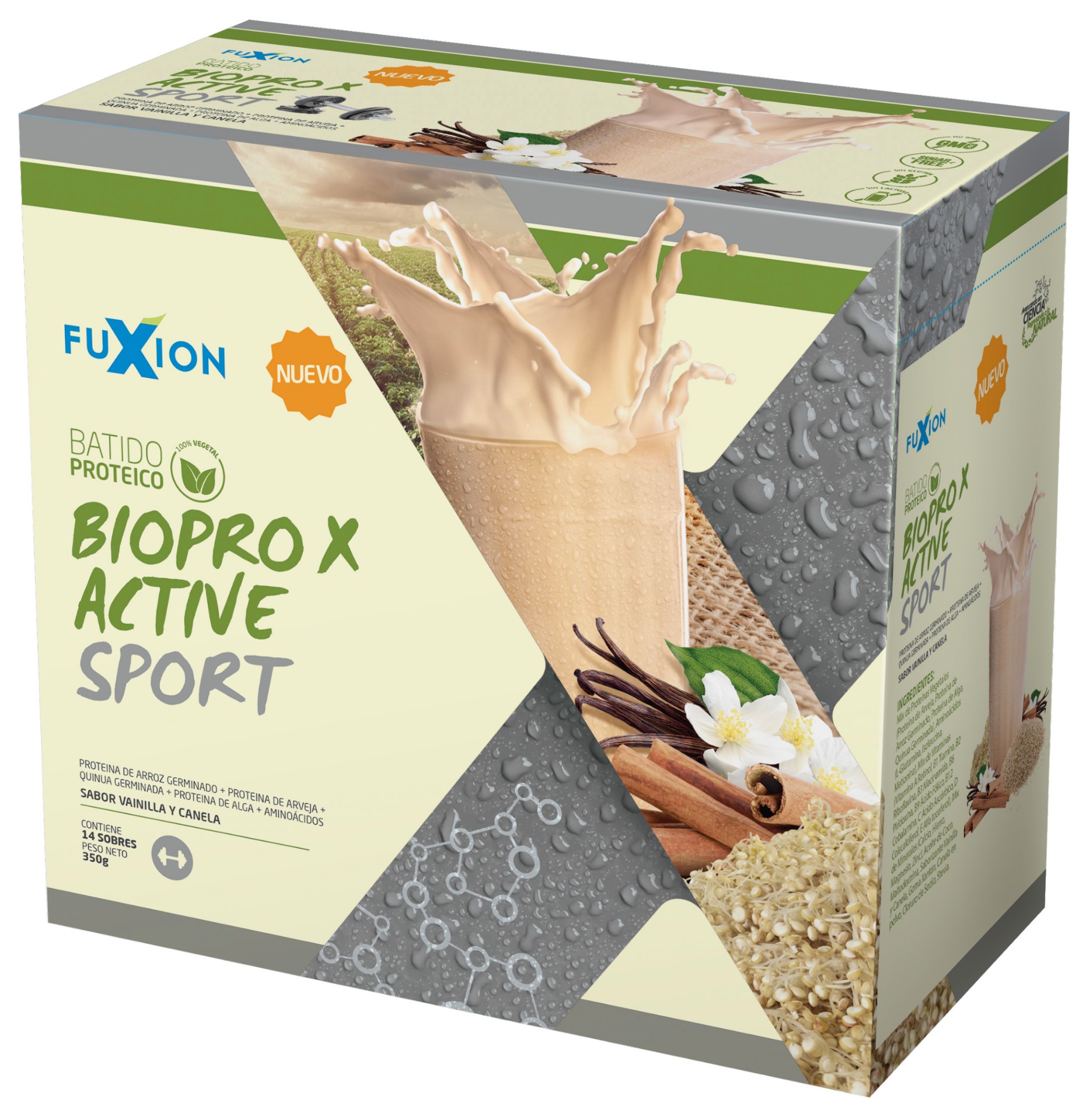 Proteína de arvejas (PISUM SATIVUM) + Granos de Quinua Germinada (CHENOPODIUM QUINOA) + proteína de Alga Espirulina (SPIRULINA MÁXIMA) + Proteína de Arroz Germinado (ORYZA SATIVA) + Aminoácidos +Aceite de Coco + Vitaminas. Los alimentos germinados nos aportan proteínas activas de origen 100% vegetal que completan la alimentación diaria con su formula baja en calorías, libre de alérgenos y de alto valor biológico.