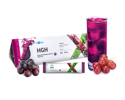Bebida funcional, sabor Uva. Combinación natural de aminoácidos, Vitaminas y antioxidantes (Resveratrol). Beneficios de su consumo: Combate los síntomas del envejecimiento, mejorando el nivel energético, anímico y la apariencia física en general, mejora la calidad del sueño y reduce el estrés. Evita le deshidratacion prematura de las células. Favorece la producción de oxido nítrico que relaja y dilata las arterias, reduciendo los niveles de Triglicéridos y colesterol, reduce la grasa corporal. Ademas protege el cerebro del estrés oxidativo (enfermedades neuro degenerativas). El uso sostenido del HGH, produce un reforzamiento en el sistema Óseo, tendones y ligamentos.